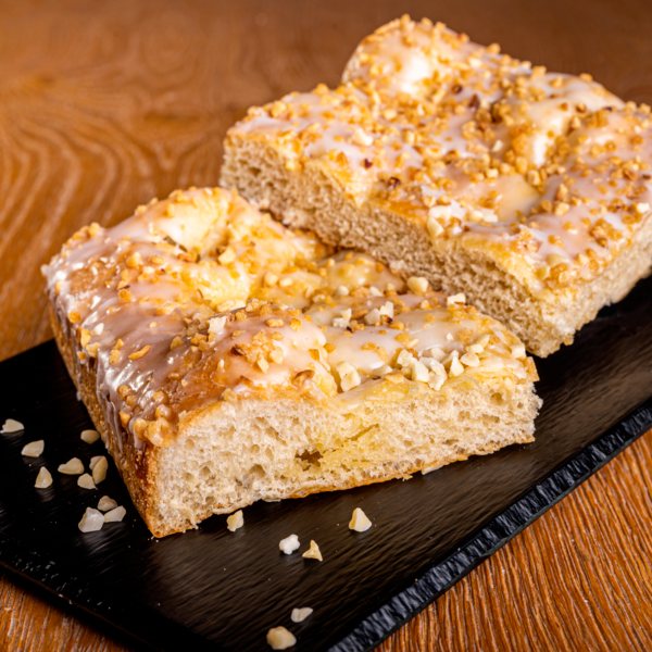 Zarter Hefeteig mit feinem Überzug aus Zuckerguß und Mandeln